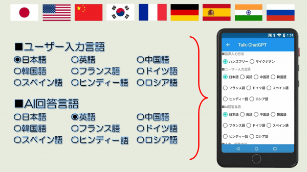(2)音声対話トーク機能は9カ国言語対応でユーザー入力言語とAI回答言語を個別選択が可能