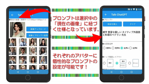 ◆トーク機能での各アバター画像とプロンプトはプログラム上で紐づく仕組みになっていますので、一度入力したプロンプトは各画像をタップすると、画像とプロンプトが一緒に入れ替わり、お好きな画像とストレスなく会話が楽しめます。