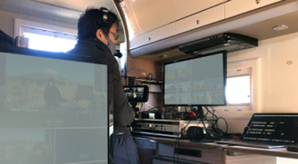 屋外撮影時の控室、編集室として利用されているキャンピングカーの様子