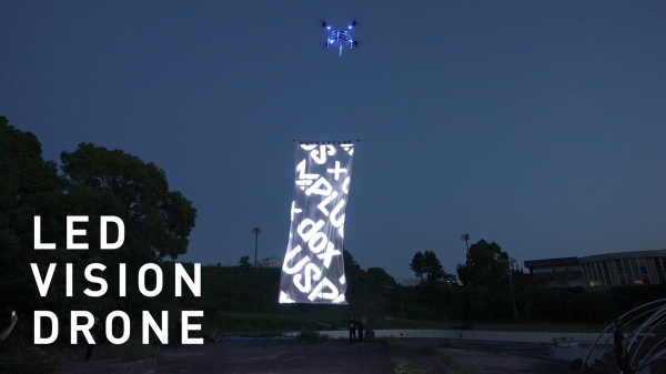 2018年に発表した「FlyingVision( https://www.mplpl.com/project/211/ )」は、ドローンの機体の外周にLEDを装着し、映像を出力していましたが、機体以上の大きさのLEDを装着することはできませんでした。第二弾となる今回の「LED VISION DRONE」は、機体の下部に積載可能な重量の範囲でLEDが装着された布製のディスプレイを吊り下げ、よりダイナミックな映像表現を可能にしました。