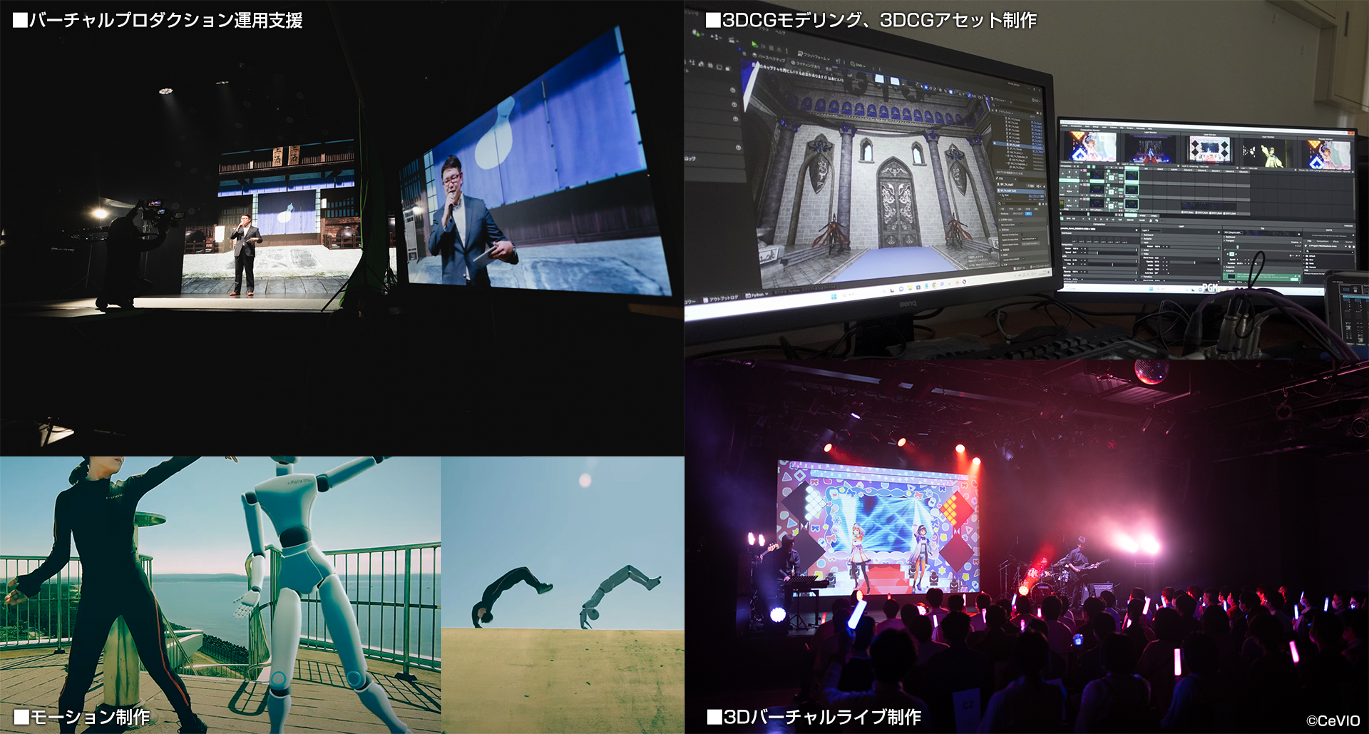 3Dのキャラクターモデルを使用した映像投影型ライブイベントの映像制作や技術サポートを行います。バーチャルライブイベントに必要な技術・ノウハウのご提供から、素材制作、ステージの機材設営、イベント中の映像・音響のオペレーションまで一括でサポートいたします。