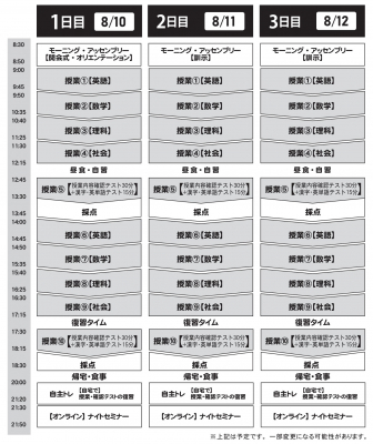 ・3日間で合計30時限、授業+確認テスト+単語テスト等を実施します。(スケジュール参照)