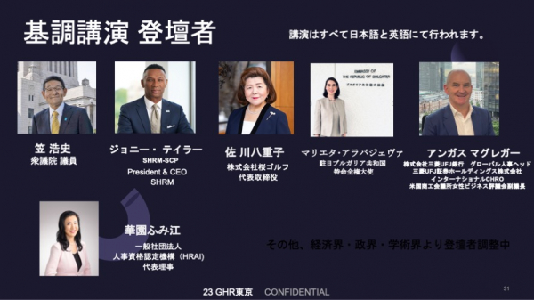 世界の人事第一人者としてG20や各国首相などに向けて講演を行うSHRM (Society for Human Resource Management) CEO ジョニー・C・テイラー氏、ブルガリア駐日大使史上初の女性特命全権大使マリエタ・アラバジエヴァ氏、日本の女性起業家を代表する存在でゴルフ会員権市場のパイオニア、株式会社桜ゴルフ 代表取締役佐川 八重子 氏に加えて、株式会社三菱UFJ銀行 グローバル人事ヘッド、三菱UFJ証券ホールディングス株式会社インターナショナルCHRO、米国商工会議所女性ビジネス評議会副議長を務められておられます、アンガス・マグレガー氏の基調講演が決定いたしました。