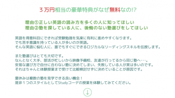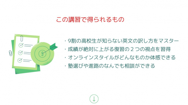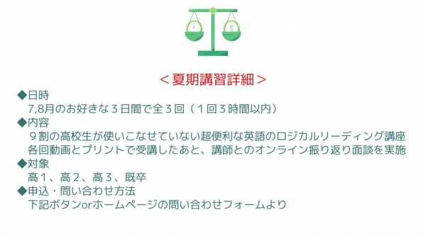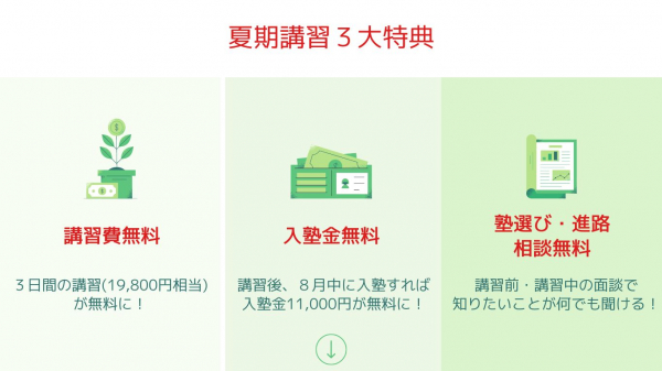 対象学年は高1~既卒生、日時は7,8月の好きな日時を選択可能、先着10名のみの実施で、夏期講習受講後に入塾した場合は入塾金免除などの特典も用意されています。