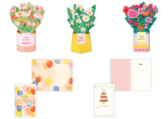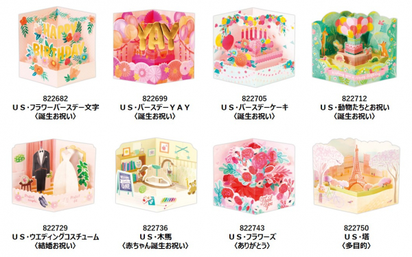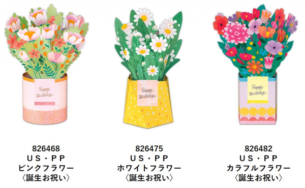 需要の高い誕生お祝いカードに、華やかな鉢植え型立体カードと、ビジネスシーンでも使いやすいシンプルな二つ折りタイプが加わりました。