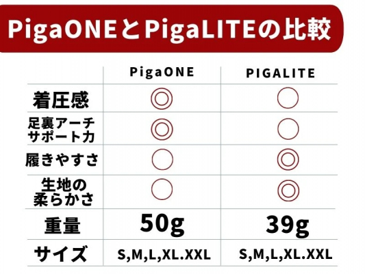 マイルドな履き心地のPigaLITEの姉妹品として、しっかり足裏を着圧して姿勢を整えてくれるPigaONE(ピガワン)もあります。