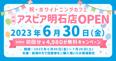 年間5万人以上の方にご来店いただいている「しみない・痛くない・30分で簡単」のホワイトニング専門店ホワイトニングカフェが兵庫県明石市に新しく、ホワイトニングカフェアスピア明石店として2023年6月30日に店舗をオープンいたしました!