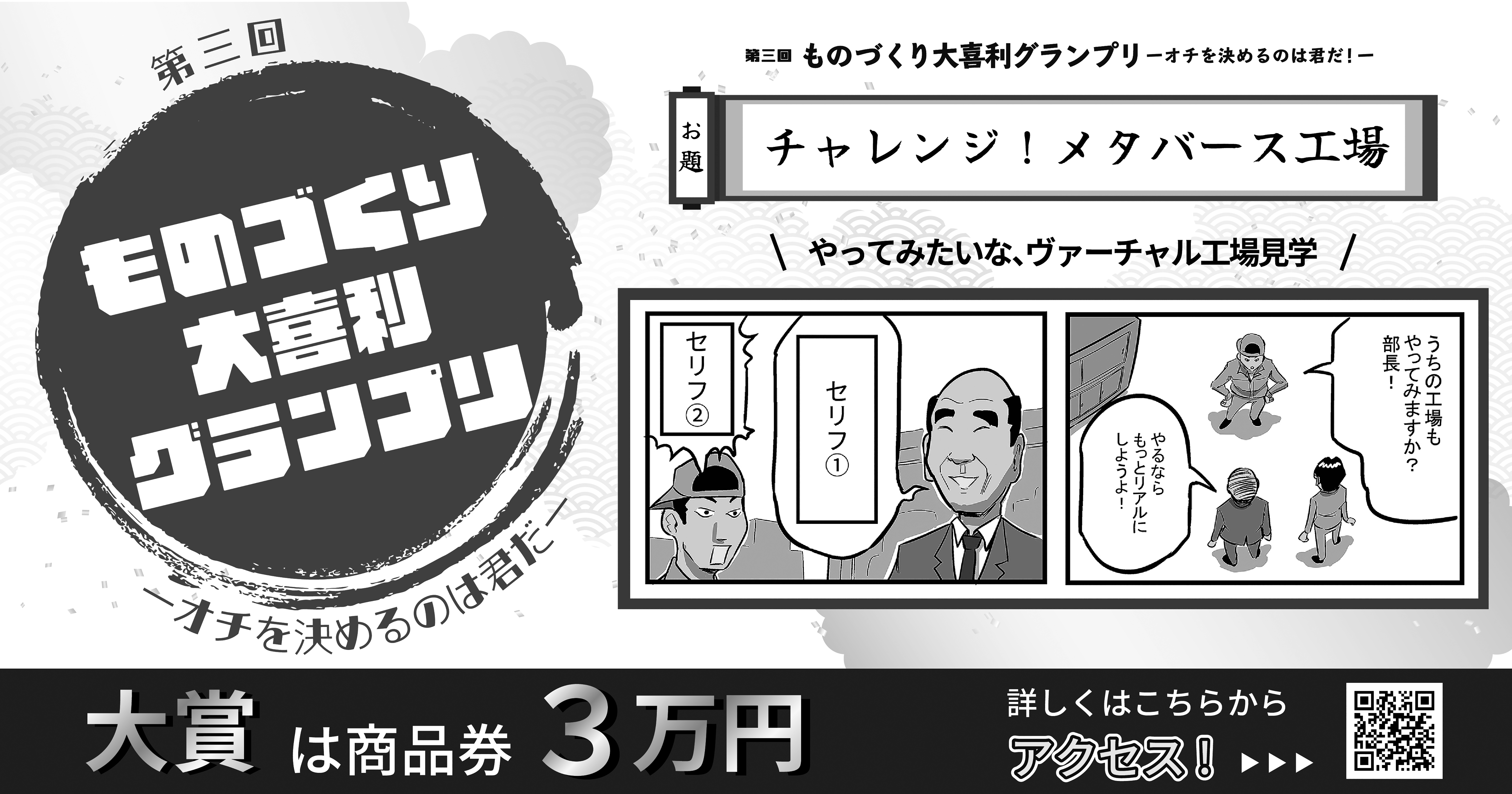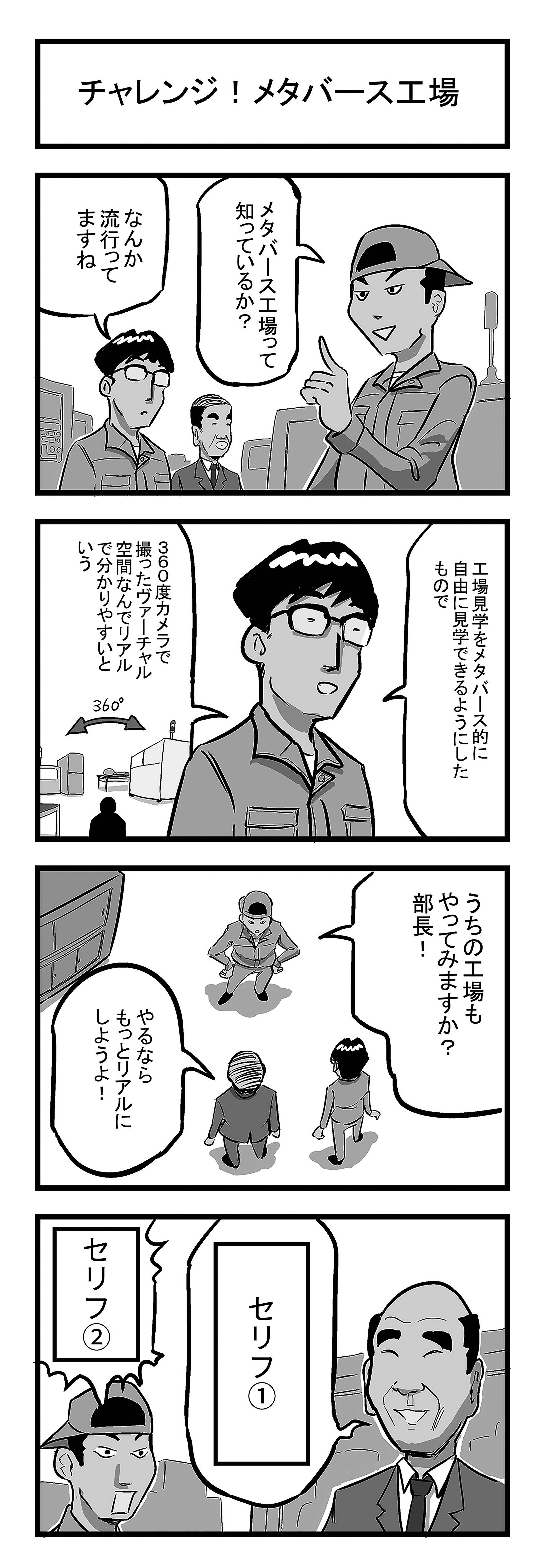 募集内容:お題の漫画「チャレンジ!メタバース工場」のオチとなるボケとツッコミのセリフの募集