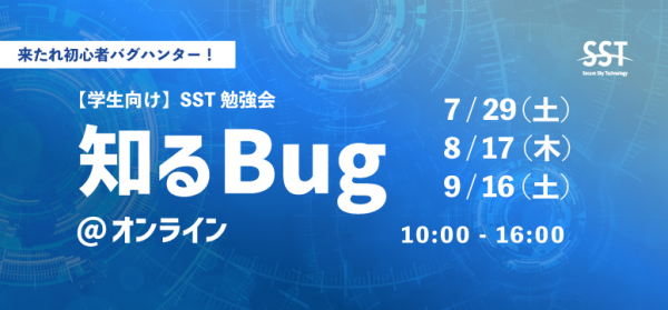 株式会社セキュアスカイ・テクノロジー(本社:東京都千代田区 代表取締役:大木 元 以下、SST)は、これからWebセキュリティを学びたい・いつかバグハンティングコンテストに出てみたいという学生に向けて、SST 勉強会「知るBug @ オンライン」の参加者募集を開始しました。第一弾は、2023年7月29日(土)、同年 8月17日(木)、同年 9月16日(土)に開催いたします。