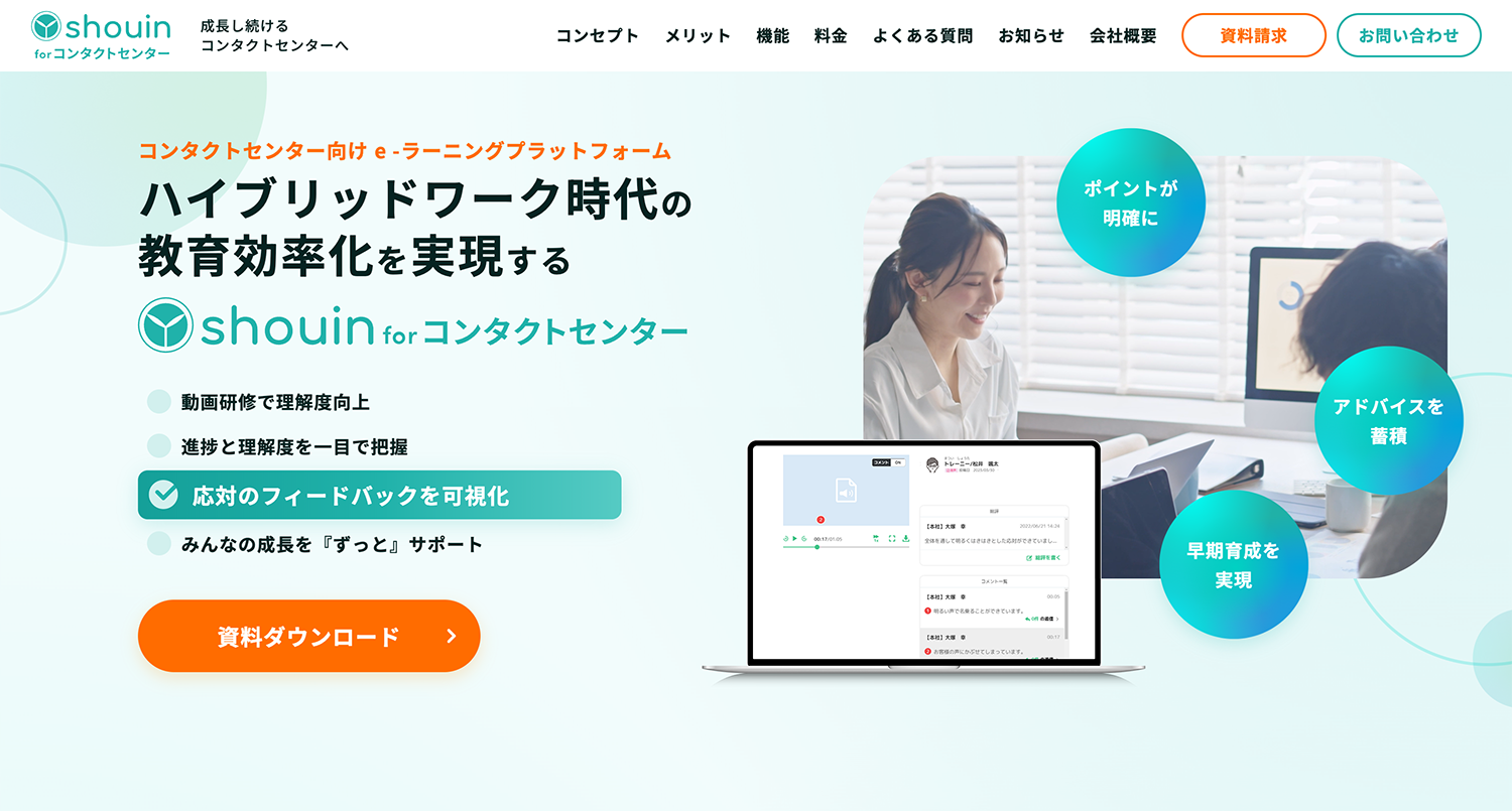 shouin for コンタクトセンターは、センターで働く全ての方が、自らの可能性を最大限に引き出し、スキルアップすることができるオンライン教育ソリューションです。