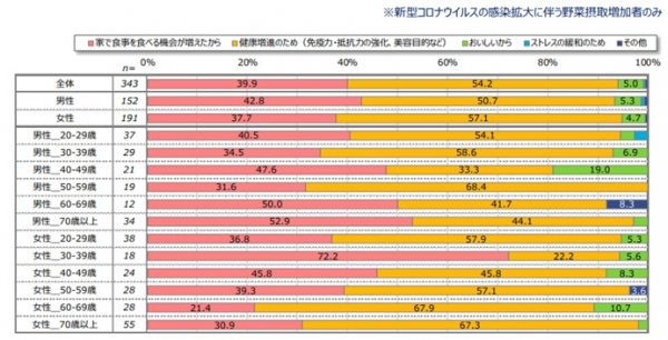 新型コロナウイルスの影響により健康を気にして野菜を食べる人が増加する一方で、価格や外で購入することを気にするなどの理由で買い控えの傾向にある人も一定数いることがわかります。