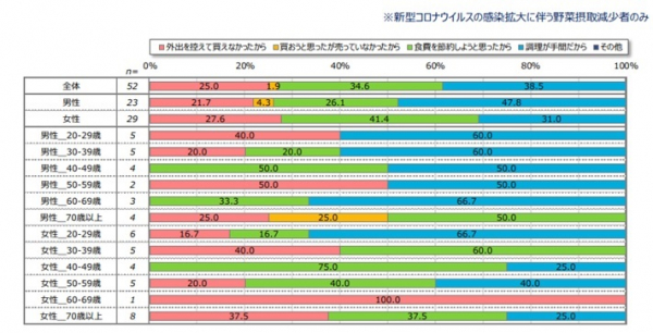 一方、野菜の摂取が減少した人の野菜摂取量低下の理由は、「調理が手間だから」に次いで「食費を節約しようと思ったから」(約35%)、「外出を控えて買えなかったから」(25%)など、価格を気にする声や、外での購入に懸念がある声があげられました。
