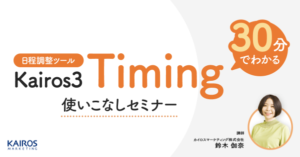 日程調整ツール「Kairos3 Timing」は、営業活動でのアポイント調整のほか、さまざまなビジネスシーンでご活用いただけるツールです。より多くの皆さまに日程調整ツールをご活用いただけるよう、この度、オンラインセミナー「30分でわかる!Kairos3 Timing使いこなしセミナー」を開催する運びとなりました。