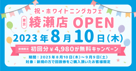 年間5万人以上の方にご来店いただいている「しみない・痛くない・30分で簡単」のホワイトニング専門店ホワイトニングカフェが東京都足立区に新しく、ホワイトニングカフェ綾瀬店として2023年8月10日に店舗をオープンいたしました!