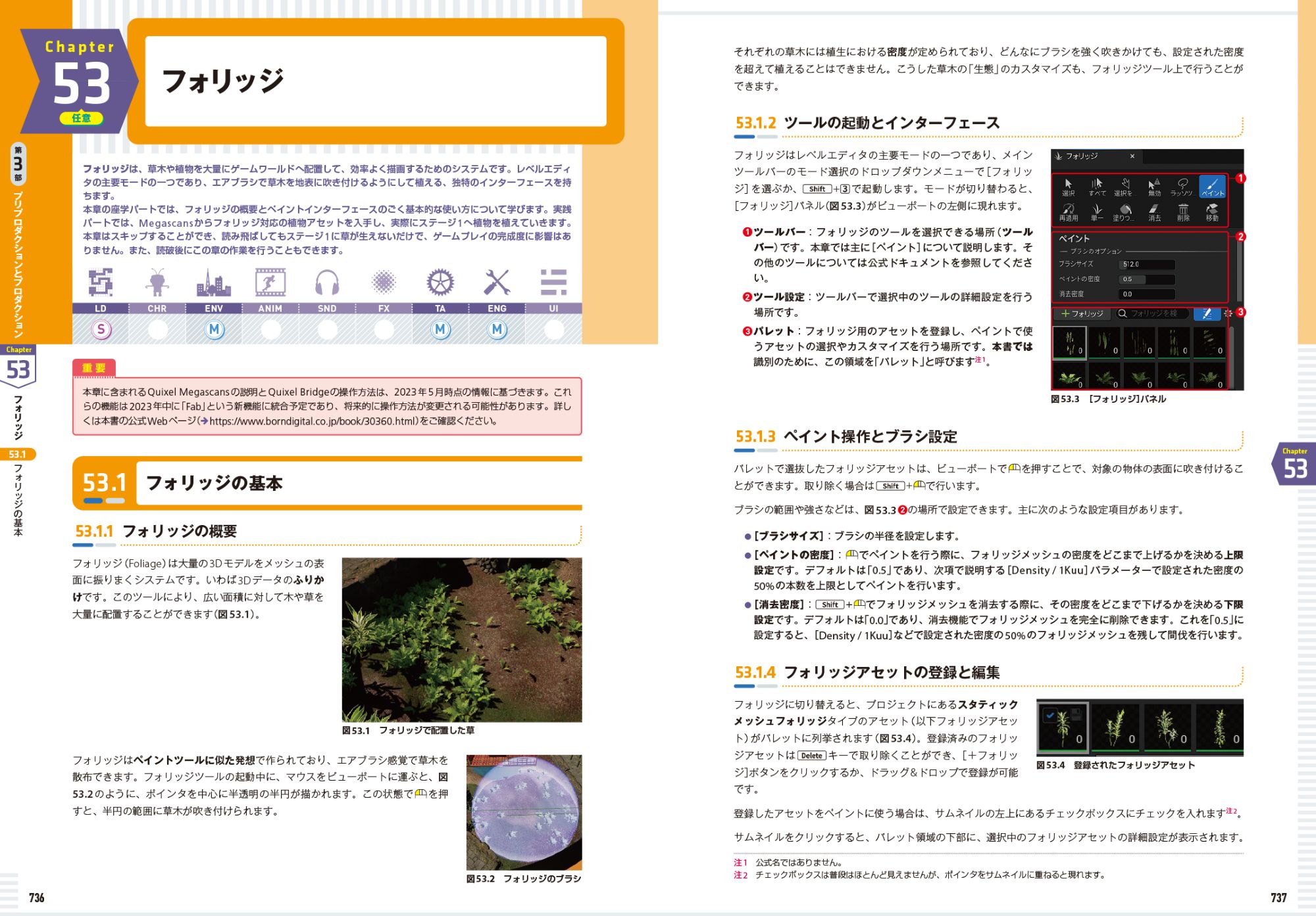 ・シーケンサー、Quixel Megascans、フォリッジ、ナイアガラ、ブループリントインターフェース、カスタムコンポーネントなど、UE4.7から今日までに追加された新機能や、前著で取り上げなかった機能を扱う章を導入