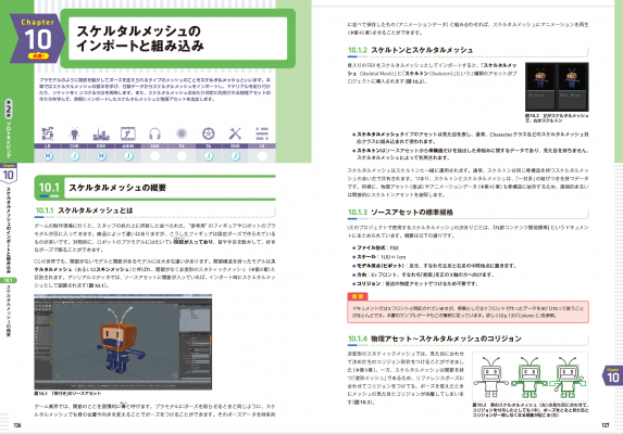 ・座学パートと実践パートに分かれたおよそ60章の大ボリュームで、プロトタイプからプロダクションまでの現代的なゲーム開発プロセスを擬似体験