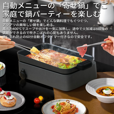 自動メニューの 「寄せ鍋」 でどんな鍋料理でもぐつぐつ、アツアツの美味しい鍋を楽しめる。