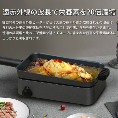 独自開発の遠赤外線ヒーターからは大量の遠赤外線が放射され、その波長は食材の水分子の波動運動を活発にすることで内側から熱を発生させます。普通の鍋調理と比べて栄養素を逃さずスープに含まれた豊富な栄養素は体にしっかりと吸収されます。