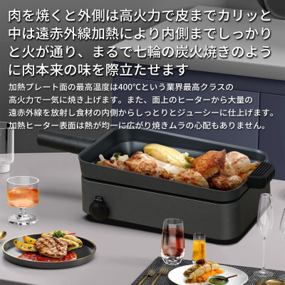 加熱プレート面の最高温度は400°Cという業界最高クラスの高火力で一気に焼き上げます。また、面上のヒーターから大量の遠赤外線を放射し食材の内側からしっとりとジューシーに仕上げます。