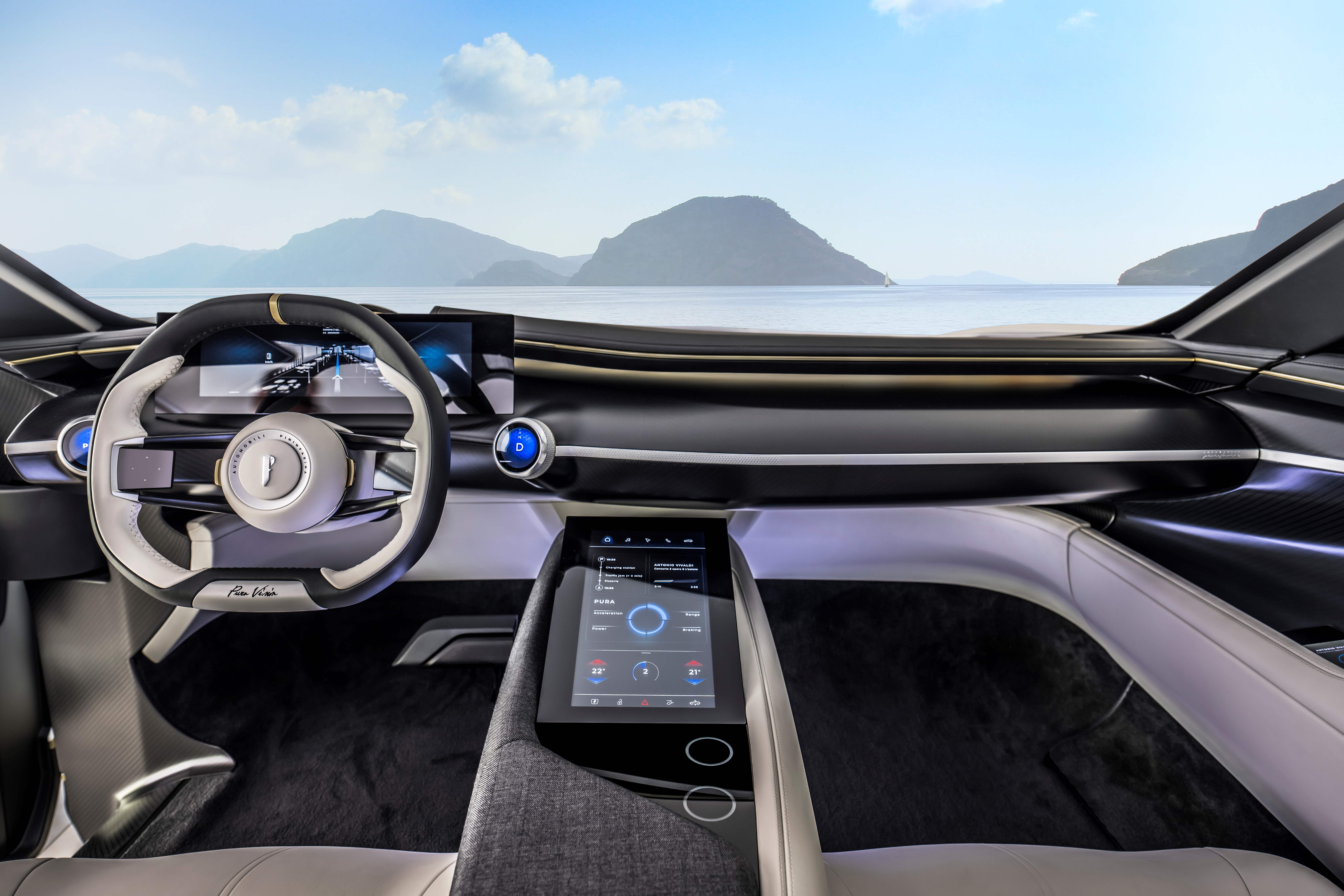 アウトモビリ・ピニンファリーナの次世代モデルは、便利なコネクテッドカーサービスをあらゆる場面で提供することを約束しており、「プーラ ビジョン」も例外ではありません。テクノロジーが満載のキャビンでは、乗員が必要なときに必要な情報を得られるよう、直感的に操作できるセントラルタッチスクリーンや高度なデジタルデバイス、ヘッドアップディスプレイなどが装備され、どれもドライバーがカスタマイズできるように設計されています。