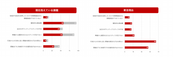 一方、コロナ禍後の本年の開催を断念した場合の理由としては「当日のボランティアスタッフの不足」も突出しているほか、「地域での合意形成の不成立」といった理由を挙げるところが目立っております。