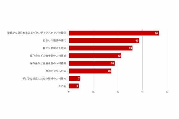 現在抱えている課題として、圧倒的に「慢性的な資金難」と回答しており、地域経済の活性化「カネ」に課題があることが明白となりました。それに連動し、準備から運営をささえるスタッフ、当日ボランティアという「ヒト」の不足も目立っていることから、資金難・人材難が浮き彫りとなりました。