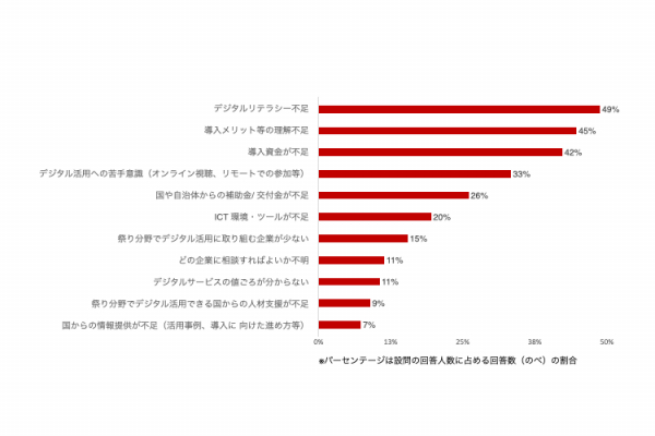 運営面、発信面ともに、デジタル活用のニーズは高い一方、デジタル活用には様々な課題が存在していることがわかりました。特にデジタルリテラシー不足(49%)、メリット理解不足(45%)、導入資金不足(42%)が高くなっています。