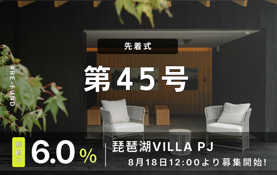 一口1万円からできる不動産クラウドファンディング「利回り不動産」を手掛ける、株式会社ワイズホールディングス(本社:東京都港区、代表取締役:和泉隆弘)は、「RE-FUND第2弾」「利回り不動産 第45号:琵琶湖VILLA PJ」の情報を公開しました。募集開始は8月18日(金)12時より先着式にて行います。