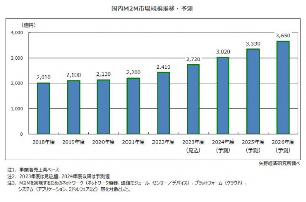 M2M需要は引き続き旺盛で、2023年度の国内M2M市場規模は前年度比12.9%増の2,720億円を見込み、2026年度まで10%前後の伸長が継続する見通しである。