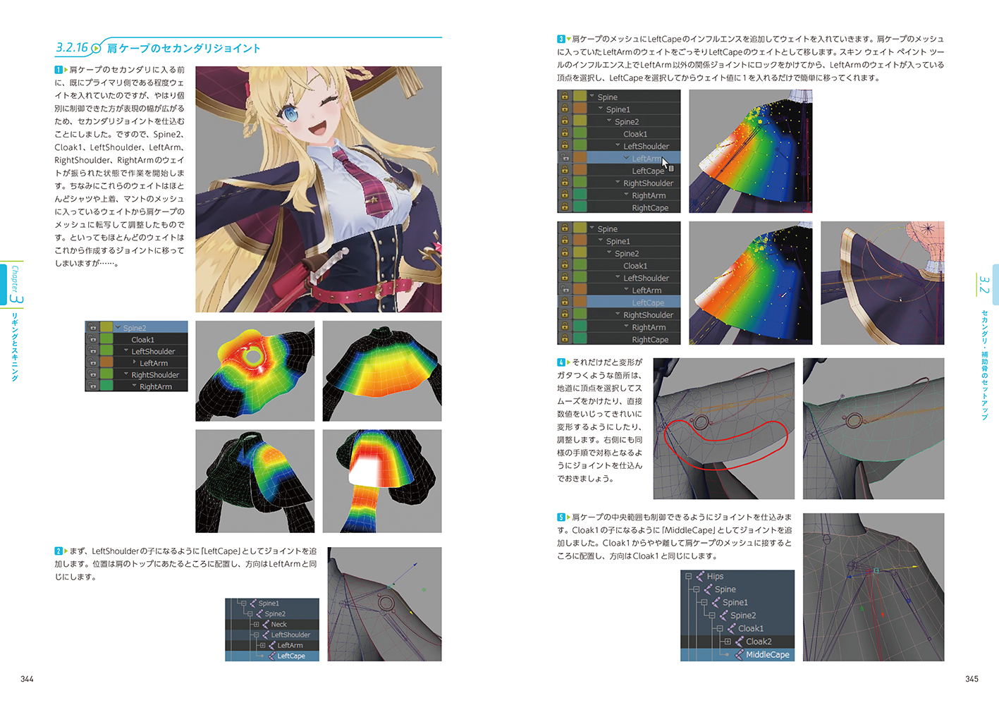 ■2章「モデリング&テクスチャリング」では、限られた期間内でより良いモデルを完成させるための効率化、顔・全身から衣装や小物まで詳細なモデリングの軌跡、UV展開やテクスチャの描き込みのながれをフィードバックと共に解説。