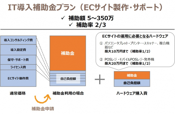 1.ECサイト制作、導入関連費(導入コンサルティング、導入サポート)、保守・サポート(補助額 5~350万、補助率 2/3)