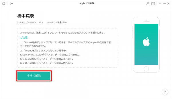 AnyUnlockの「AppleIDを削除」機能を使用すれば、Apple IDとApple IDに関連付けられたパスワードを忘れていても、Apple ID自体を削除し、デバイスを初期化することができます。この機能は操作がシンプルであり、初心者でも簡単に利用することができます。