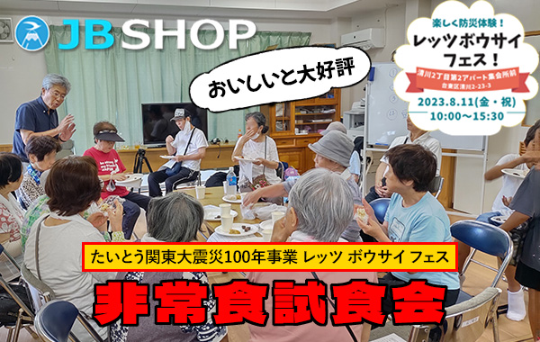 また、台東区との協働事業「防災コミュニティ構築事業」では、『JB SHOP』が扱う非常食試食会に参加された皆様からは、「(高齢者の方が)乾パンしか知らなかった」、「非常食がこんなにおいしいとは」、「おいしい!普通のパンと変わらない」、「えっ!5年ももつの」「(小さなお子様から)もっとちょうだい!」等、大好評をいただきました。