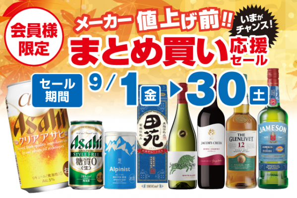 全国に188店舗で酒の専門店をチェーン展開する株式会社リカーマウンテン(本社:京都市)は、9月1日(金)~30日(土)の間、深夜営業店舗などの一部を除く店舗で「会員様限定 メーカー値上げ前!!まとめ買い応援セール」を開催いたします。