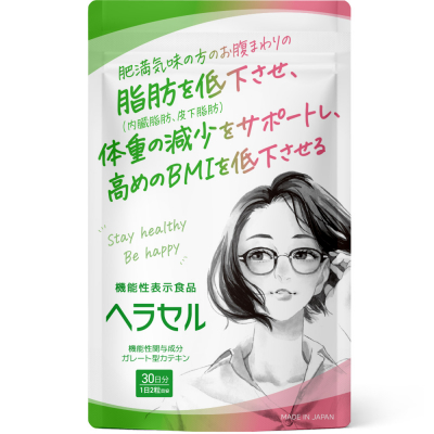 「ヘラセル」は、お茶に含まれるカテキンの1種で、肥満気味の方のお腹まわりの脂肪(内臓脂肪、皮下脂肪)を低下させ、体重の減少をサポートし、高めのBMIを低下させる機能が報告されているガレート型カテキンを150mg(2粒0.6g当たり)配合した機能性表示食品です。さらに、サポート成分として、桑の葉、サラシア、白インゲン豆、ガルシニア、ビタミンB1、ビタミンB2、ビタミンB6を配合。ガレート型カテキン製品に新たな価値を付加し、いつでも・どこでも場所や時間を選ばず摂取できる手軽さで、より多くのお客様の健康をサポートしてまいります。