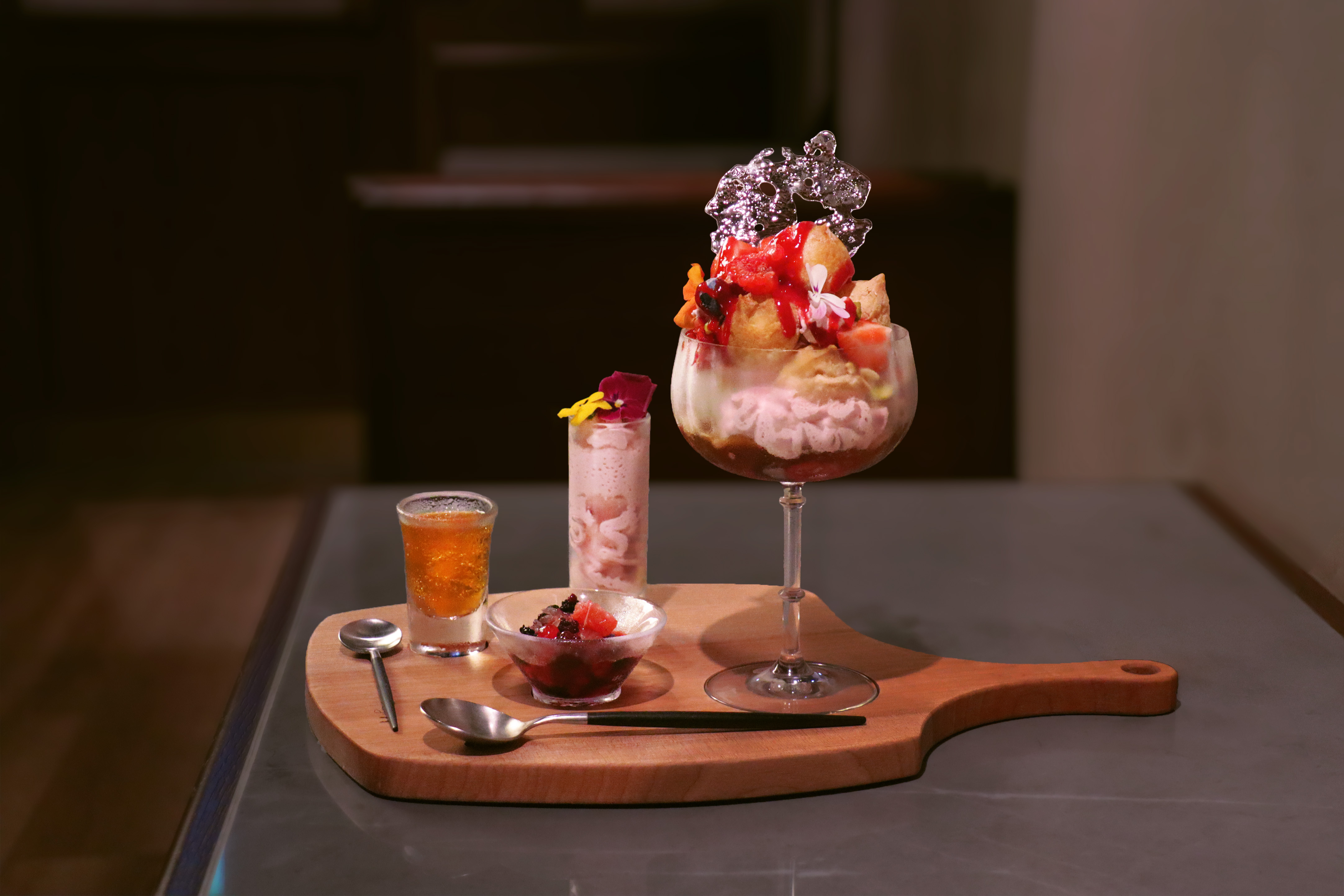 キラキラと輝く飴細工の下には、ベリーとエディブルフラワーが散りばめられたミニシュークリームの山、そこにピンクに色づくベリー生クリームが可愛らしく飾られた今回のパフェ。