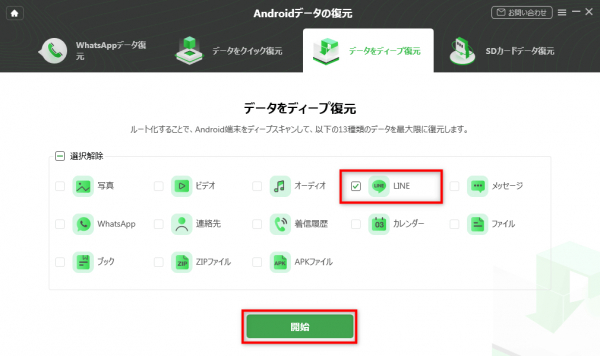 2、LINEのアイコンにチェックを入れ、「開始」をクリックします。
