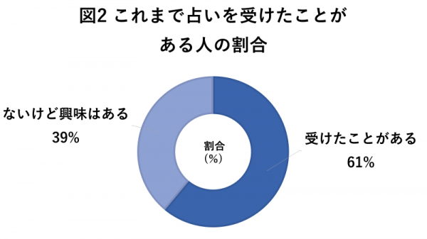 回答者のうち、実際に占いを受けたことがあると回答した方はおよそ6割、受けたことはないものの興味はあると回答した方はおよそ4割みられました。