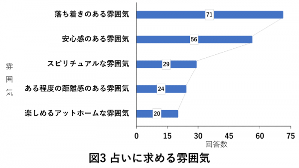 最も求められていた占いの雰囲気は「落ち着きのある雰囲気」。次に「安心感のある雰囲気」が多く選ばれていました。本調査の中では、ワイワイ楽しめる雰囲気よりもリラックスできるような落ち着きある雰囲気が求められやすい傾向にありました。