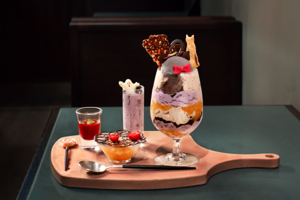 喫茶パステトに、今年もハロウィンパフェが登場します。今回は人気商品である三毛猫ショコラパフェがハロウィン仕様に変身。ほうきに乗ってやってきた魔法使いの黒猫を、チョコと黒ゴマアイスで再現し、三毛猫やゴーストと楽しくパーティーをするようなイメージで仕上げました。
