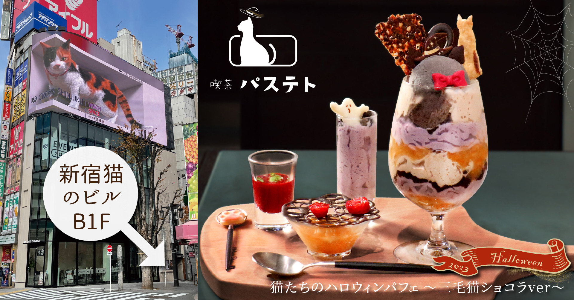 株式会社アズフードシステムズ(本社:東京都中央区、代表取締役:森田威)が運営する、新宿駅東口すぐの喫茶店「喫茶 パステト」では、人気の三毛猫ショコラパフェがハロウィンの装いになって『猫たちのハロウィンパフェ ~三毛猫ショコラver.~』として登場。2023年10月3日(火)より期間限定発売いたします。