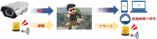 「防犯カメラだけでは防げない…」、「パトライトだけでは後追いができない…」という悩みを解決し、「検知+威嚇+証拠保存」を網羅した防犯・監視システムを構築することができます。