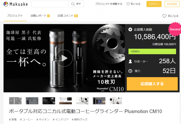 「CM10」は2023年12月13日よりMakuakeにてクラウドファンディングを開始し、わずか10日間で1000万円以上の資金を集めた注目のコーヒーグラインダーです。14日のMakuakeランキングでは総合1位になり、グルメ、ガジェット部門でも1位をいただき3冠を達成しました。