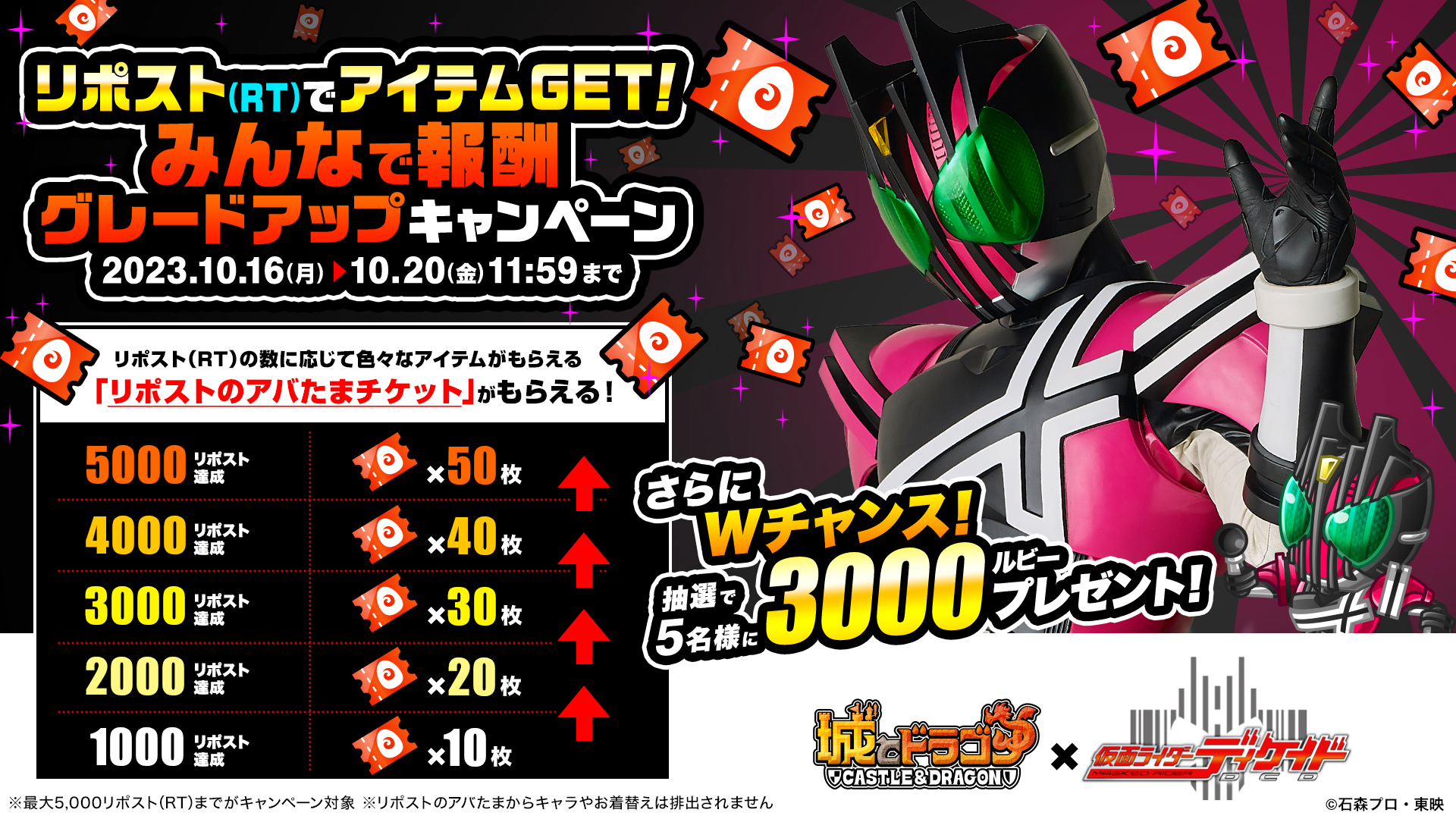 10月20日(金)より『城とドラゴン』にて、3連続コラボの第1弾として『仮面ライダーディケイド』との復刻コラボイベントを開催することが決定いたしました。コラボ限定キャラ「ディケイド」が再び登場し、新たな激レアお着替えが追加されるほか、10月16日(月)から「リポスト(RT)でアイテムGET!みんなで報酬グレードアップキャンペーン」を実施いたします。ぜひこの機会をお見逃しなく!