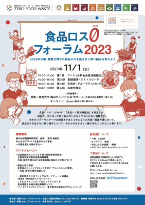 企業・市民活動団体、教育機関、行政が一体になって2030年のSDGs(持続可能な開発目標)達成を目的に設立された「関西SDGsプラットフォーム 食品ロス削減分科会 ZERO FOOD WASTE」が主催する「食品ロス0(ゼロ) フォーラム2023」を対面とオンラインで実施。食品メーカー、物流、流通、小売店、飲食店、生産者、教育関係者、消費者、行政、メディアなど、分野や立場を問わず“食品ロス削減”の現状と取組みを知っていただくためのフォーラムです。