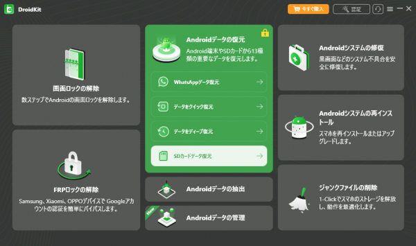 Step1.パソコンでDroidKitをダウンロードして起動します。ホーム画面で「Androidデータの復元」から「SDカードデータ復元」を選択します。