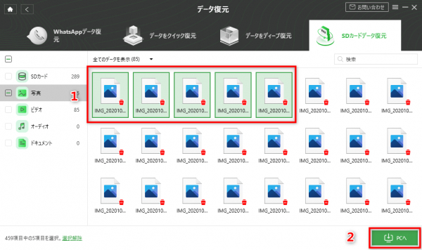 Step5.スキャンが終わりますと、SDカードでに既存しているファイルと削除したファイルが全て表示されます。復元したい画像を選択して「PCへ」をクリックします。復元がすぐ始まります。