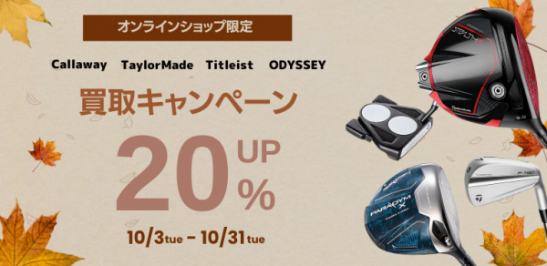 株式会社ゴルフ・ドゥ(本社 さいたま市 代表取締役社長:佐久間功)が運営するゴルフドゥ!オンラインショップ内のオンライン買取限定で10月31日(火)までの期間、対象ゴルフクラブの買取査定が20%増額となるキャンペーンを実施中です。対象となるゴルフクラブブランドは「キャロウェイ」、「テーラーメイド」、「タイトリスト」、「オデッセイ」のAランク・Bランク・Cランクのクラブです。