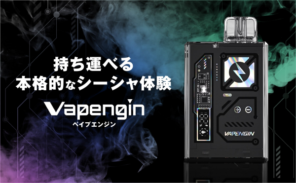 濃厚なフレーバーを楽しめ、さらに吐き出す蒸気の香りにまでこだわった持ち運びシーシャ「Vapengin(ベイプエンジン)」。最後までフレーバーの風味を最大限お楽しみいただる全世界累計販売1,500万台を突破した持ち運びシーシャです。