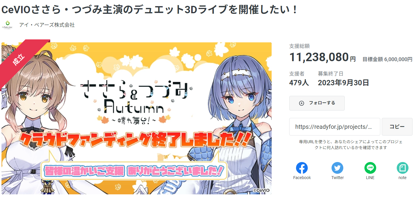また、本イベント開催のために実施したクラウドファンディングでは、多くのファンのご支援をいただき、目標額の600万円を大幅に超える総支援額1,123万円を達成いたしました。